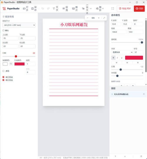这是一款适合公司的实用工具,主要用于内部标准化文件、信纸和稿纸的生成打印。该应用是一个全面的信纸设计平台,可以创建各种信笺纸和稿纸。它预设了几种简单模板,并提供了一个设计界面,可以添加多种元素来设计个性化信笺纸,甚至可以加入公司logo作为抬头。设计完成后,只需点击打印即可通过打印机直接打印出所需的文档以满足日常办公需求。