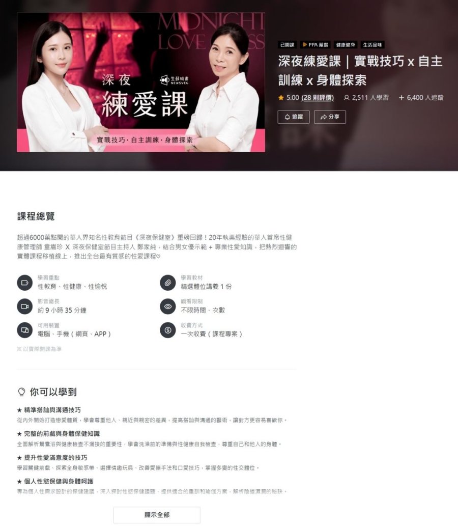 超过六千五百万次点阅的华人知名性教育节目《深夜保健室》重磅回归!拥有二十年执业经验的华人首席性健康管理师童嵩珍与节目主持人郑家纯,结合男女示范+专业性爱知识,将热烈反响的实体课程移植到线上,推出全台最精致的性爱课程。