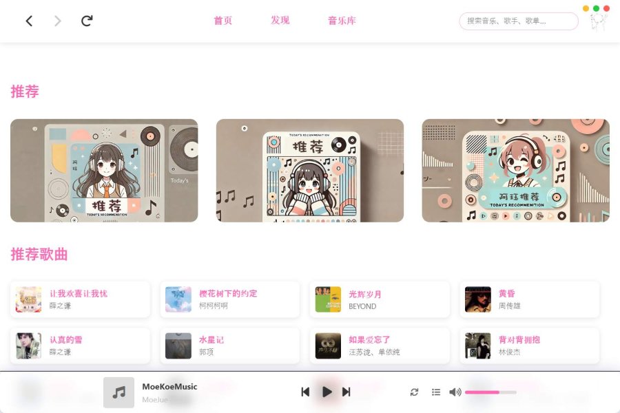 1. 开源与多平台支持:MoeKoeMusic由iAJue开发,兼容Windows、macOS和Linux多平台,其二次元风格增添了视觉吸引力。