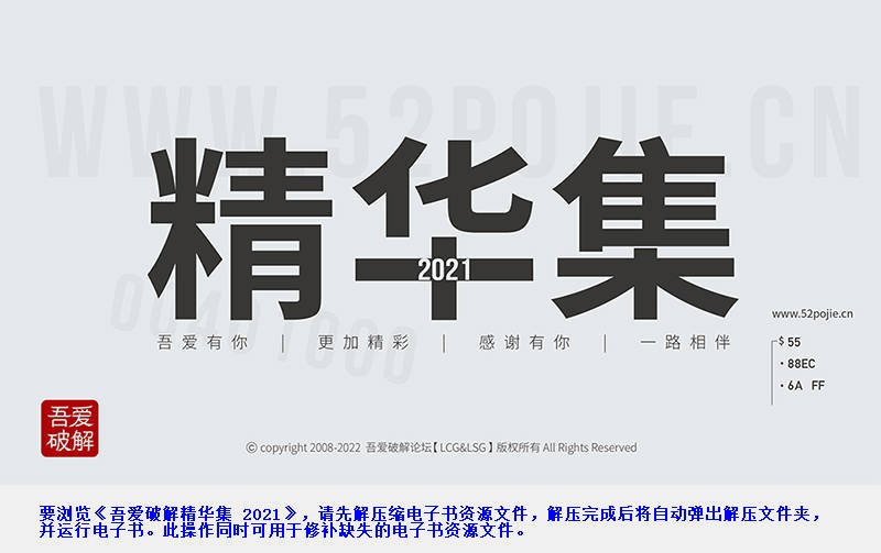 欢迎浏览《吾爱破解精华集 2021》!此书收录了吾爱破解论坛在2021年发布的优质文章。