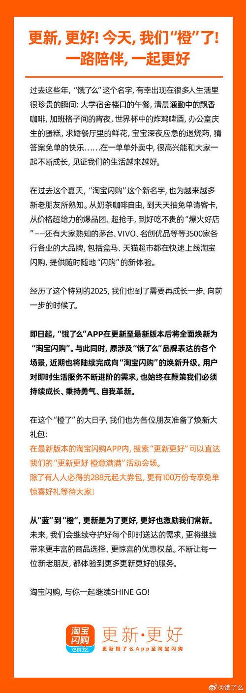 12月5日,淘宝闪购官方微博账号发文:“更新,更好!今天,我们‘橙’了!”值得一提的是,尽管图片右下方的角标仍显示着”饿了么“字样。