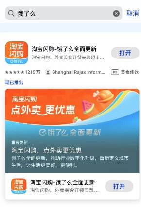 小刀翻看苹果应用程序商店,在搜索框查询“饿了么”显示“淘宝闪购-饿了么全面更新”的应用。