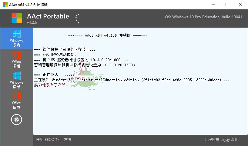 AAct是一款由俄罗斯人Ratiborus制作的实用全能KMS激活工具,可以自动设置密钥管理服务激活微软Windows、Office产品。支持离线KMS激活,安装及删除激活产品密钥、创建及删除续期计划任务。该工具无需.NET Framework框架,体积小巧、单执行文件、绿色无残留,激活成功率高!