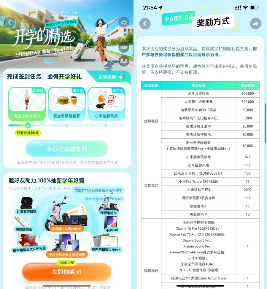 每天通过抖音精选APP搜索“开学的精选”->观看3分钟视频即可完成签到