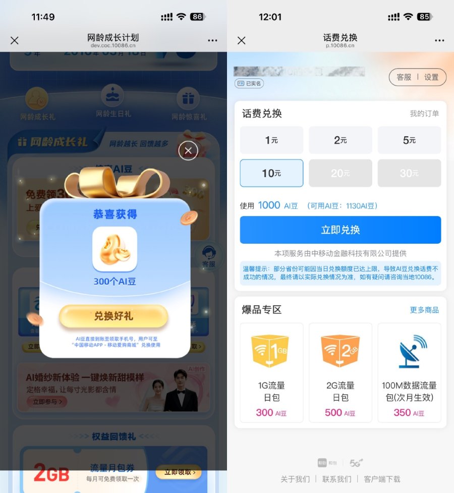 先领取大约100到500个AI豆,然后兑换成话费,若当日没有库存可等待次日再进行兑换。