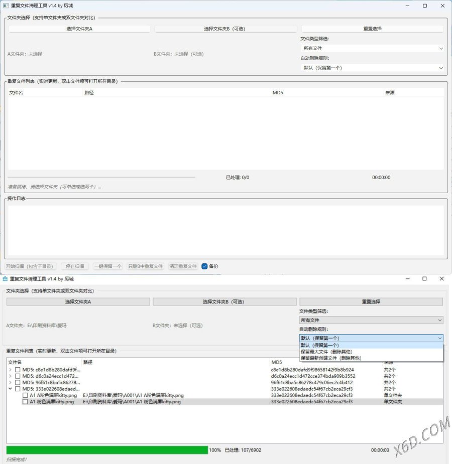 一键保留功能:扫描完成后点击 "一键保留一个" 按钮,自动为每组重复文件保留第一个并勾选其余,大幅减少手动操作。