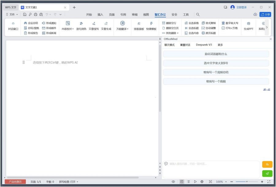 Officemind 是一款无收费且无广告的智能办公助手套件,基于 deepseek 等先进模型的智能化处理,支持文档智能处理、一键AI PPT 和表格统计等功能,旨在提高办公效率。尽管市场上已有不少类似的办公工具,但大多数要么有收费限制要么需要扫码登录或复杂的API配置才能使用。因此,这些软件都不在本帖的推荐及讨论范围内。而这款产品则可以作为上述情况的替代选择,免费无广告、占用空间小、无需登录接口和功能限制。它适用于 Win 7 至 11 Office 2010 及以上系统环境。