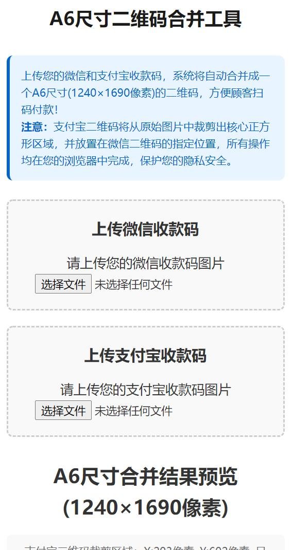 上传你的微信收款码和支付宝收款码,系统会自动合并成A6尺寸二维码,方便顾客扫码支付。