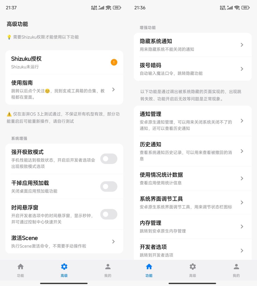玄戒工具箱app 是专为小米澎湃OS系统设计的第三方玩机工具,以无需Root权限、功能全面且深度适配系统著称。其核心功能包括性能优化、界面定制与实用快捷操作三大方面:支持关闭桌面预加载、激活Scene模块提升流畅度;可精细化调节系统动画、突破通知图标显示限制,并隐藏状态栏Wi-Fi、信号等图标;新增5G快速开关、阅读模式、极暗模式等控制中心快捷方式,还能强制开启小米15SP全天候AOD显示。