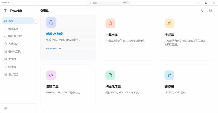 一款开源、轻量级、完全离线且跨平台的工具箱(支持多国语言,中文和英文)。TroveKit你可能经常需要用到这些"小工具":哈希、加解密、编码、JSON 格式化、二维码生成以及简单的古典密码。