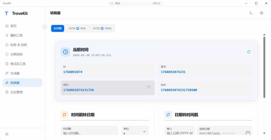 TroveKit 是一个多功能的离线工具箱,能够满足用户在多个场景下的需求。从哈希计算到古典加密技术,再到数据格式转换与管理,它都提供了全面的支持。通过直观且现代化的设计以及强大的内置工具集,TroveKit 成为了开发者和其他需要这类实用程序的人士的理想选择。