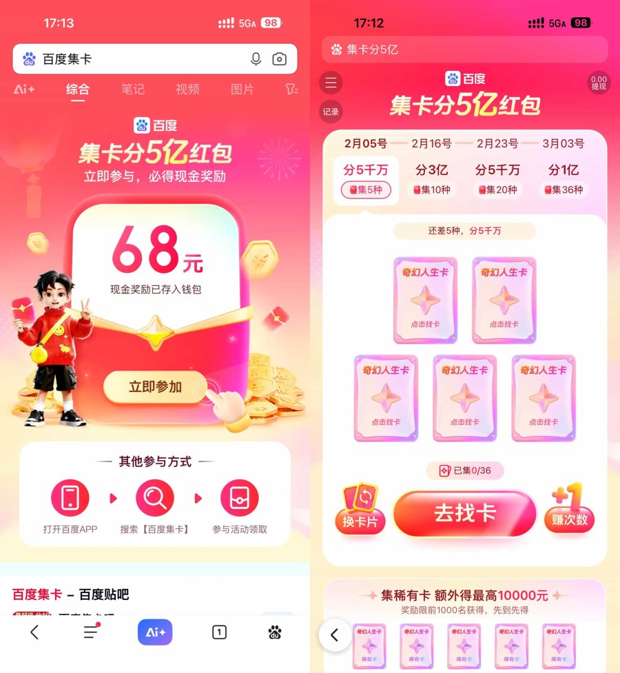 打开百度APP搜索“百度集卡”->收集5/10/20/36张不同卡片,分别在2月5日/2月16日/2月23日/3月3日,有机会瓜分0.5/3/0.5/1亿亓红包