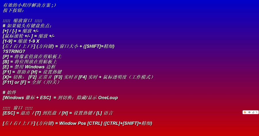|直接启动OneLoupe程序后自动显示一个放大的区域,并可通过拖动调整显示位置。 |用户可以根据需要调整放大的倍数。 |程序在托盘区域显示时点击托盘图标可弹出功能菜单,并可在菜单中进行热键及ESC隐藏等操作。 |在程序内设定快捷键来启动放大大镜(如WIndow+ESC)。 |按住Ctrl键并单击左或右按钮可以切换不同的放大幅数,最大可达16倍。